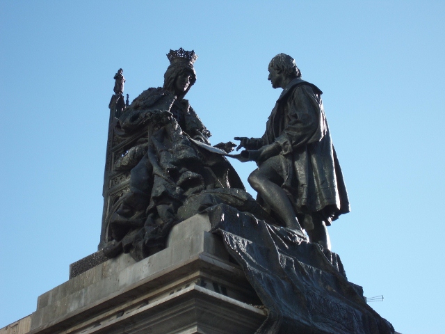 Delante de la reina, y con un gesto de inclinación, aparece Cristobal Colón mostrando un pergamino con las intenciones de su viaje. Bajo ellos y a modo de decoración aparece una gran alfombra que se deja caer y que se sale fuera del espacio escultórico. En esta alfombra podemos ver los símbolos de los Reyes Católicos, como el yugo y las flechas, así como las fechas de 11 de enero de 1492 y 12 de octubre de 1492.
